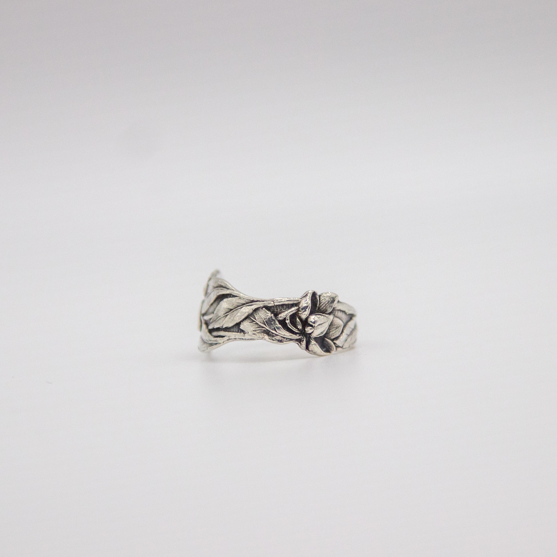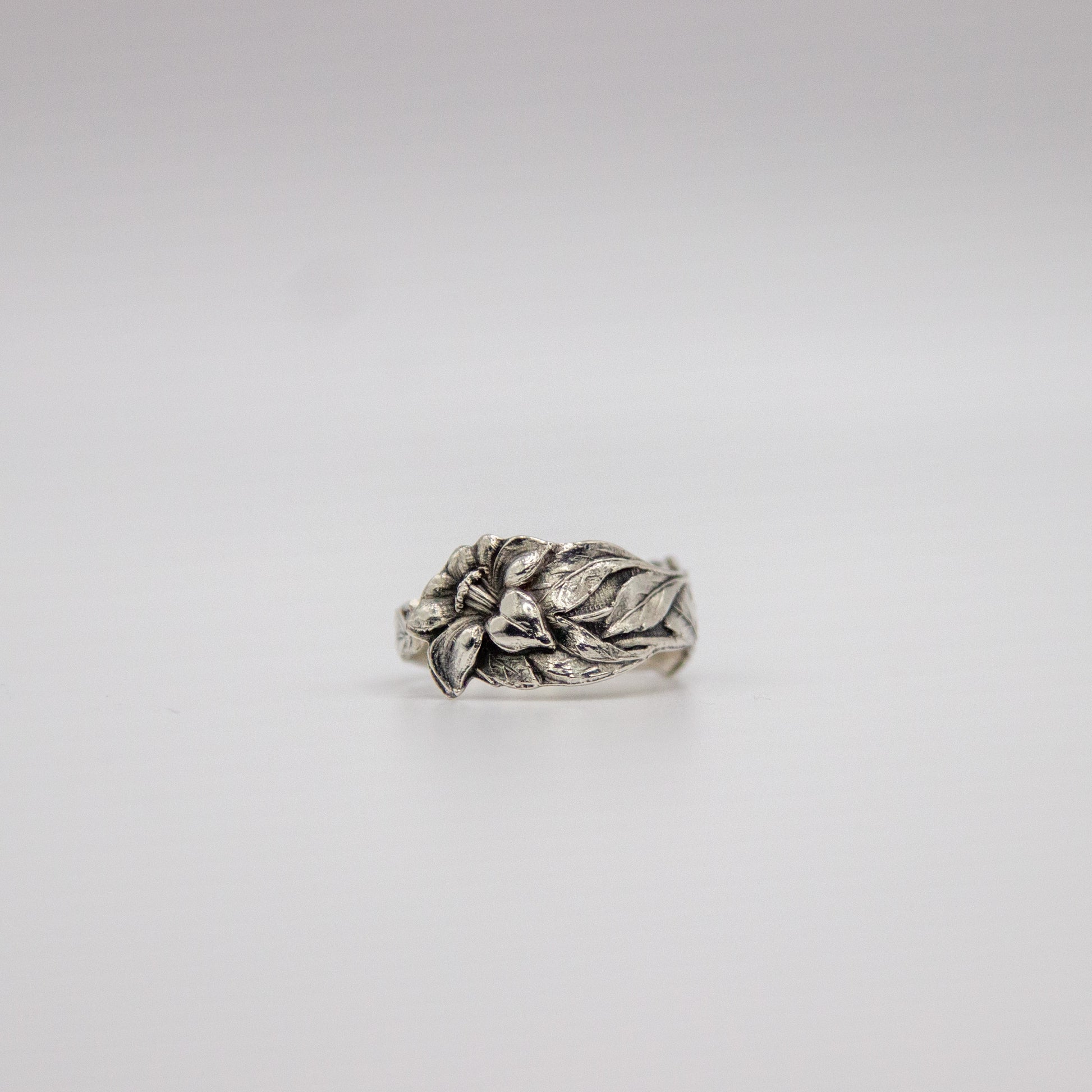 This beautiful spoon ring features a delicate lily flower on the front and side of the ring, accompanied by a detailed pattern of leaves beneath.